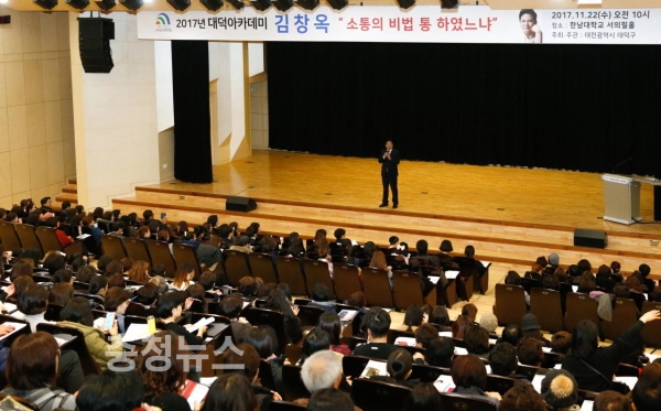 대전 대덕구(구청장 박수범)는 22일 오전 한남대학교 서의필홀에서 김창옥 강사를 초빙해 ‘소통의 비법 통하였느냐’라는 주제로 ‘2017 대덕아카데미’ 2차 강좌를 개최하고 주민들의 큰 호응을 받으며 성황리에 마쳤다.