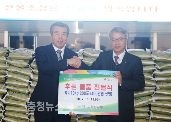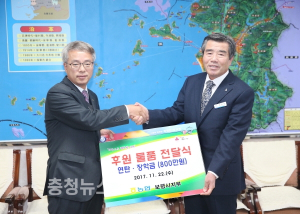 농협 보령시지부(지부장 이웅원)가 22일 오전 보령시를 찾아 추운 겨울을 맞는 어려운 이웃에게 전달해 달라며 성금과 물품을 전달했다.