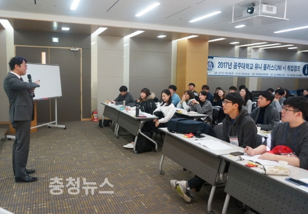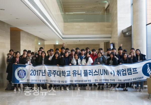 공주대학교(총장직무대리 김희수) 취업지원실에서는 지난 18일부터 19일까지 양 이틀간 충남 금산군에 위치한 현대해상 연수원에서 대전·충청 지역 8개 대학 대학생 40여 명이 참여한 가운데 ‘공주대학교 유니 플러스(UNI+) 취업캠프’를 개최했다고 22일 밝혔다.