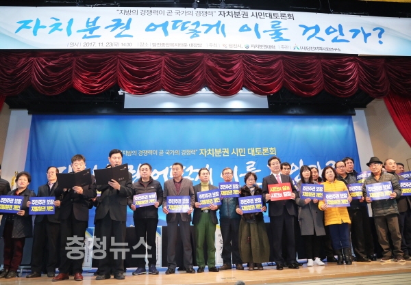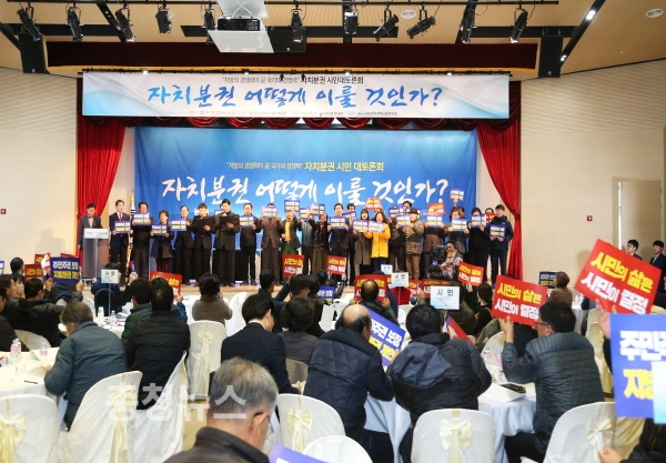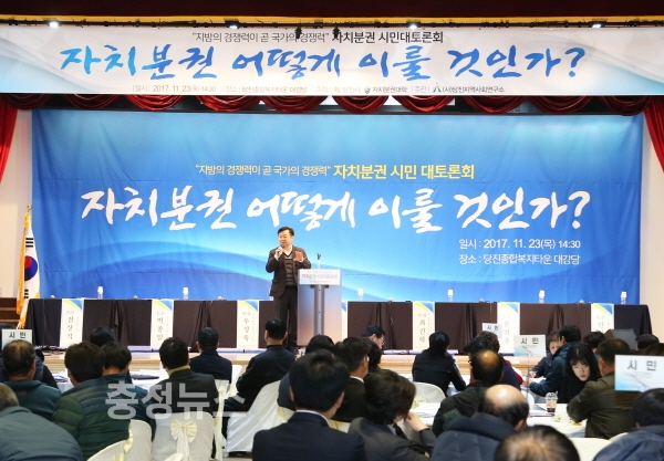 충남 당진에서 지방분권 개헌을 촉구하는 시민 결의대회와 자치분권 실현방안을 모색하는 시민 대토론회가 23일 당진종합복지타운 대강당에서 열렸다.