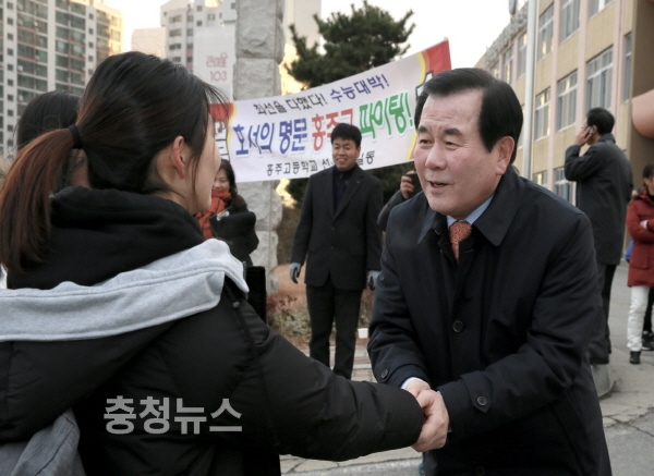 김지철 충남교육감은 23일 홍성의 홍주고 정문 앞에서 2018학년도 대학수학능력시험 수험생 응원에 나섰다.