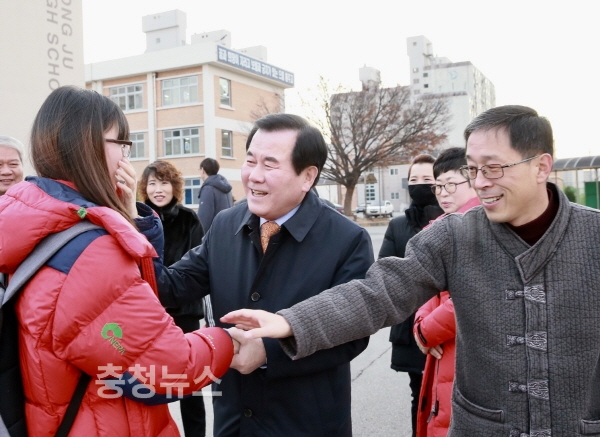 김 교육감은 선배들을 응원하기 위해 새벽부터 나온 재학생들과 학부모, 교직원 등과 함께 홍주고 수험장으로 입실하는 수험생들에게 격려구호를 외쳐주고, 따뜻한 차를 타서 건네주는 등 활동을 펼쳤다.