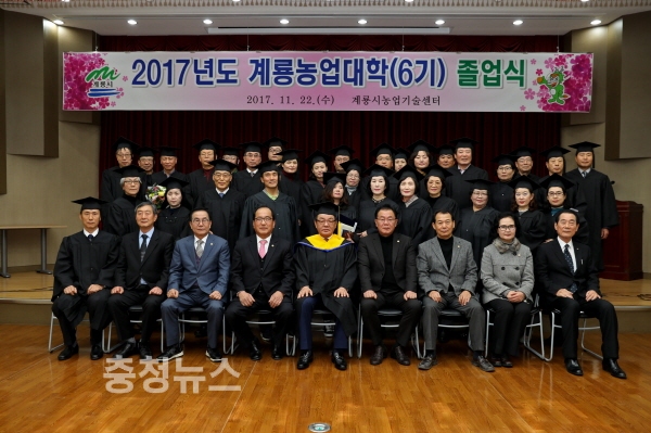 충남 계룡시(시장 최홍묵)는 지난 22일 기술센터 대강당에서 졸업생, 가족 친지 등 60여 명이 참석한 가운데 제6기 계룡농업대학 졸업식을 가졌다.
