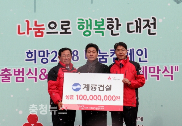 한편 이날 행사에는 이재관 대전시장 권한대행, 안기호 대전 사회복지공동모금회장, 김경훈 대전시의회의장, 설동호 대전시교육감, 이장우 국회의원, 이상민 국회의원, 한현택 동구청장, 박용갑 중구청장, 허태정 유성구청장, 한화이글스 김태균 선수 등이 참석했다.