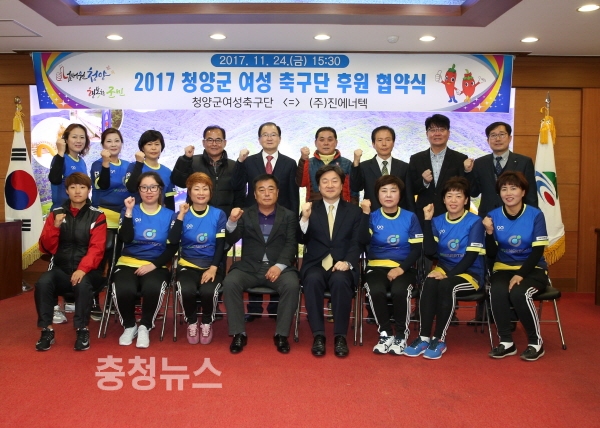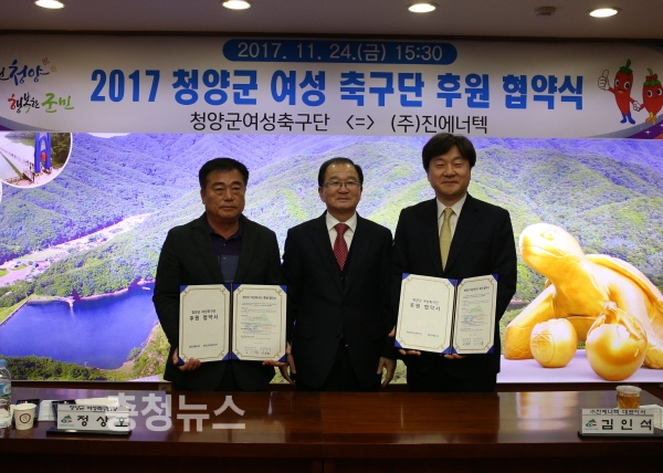 충남 청양군(군수 이석화)은 24일 군청 상황실에서 비봉면 농공단지 입주업체 ㈜진에너텍(대표 김인석)과 청양군 여성축구단(단장 정상호)에 대한 후원 협약을 맺었다고 밝혔다.