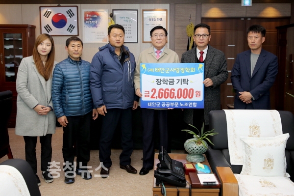 다음날인 24일에는 태안군 공공부문 노조연합(의장 손필성)이 한상기 군수 등이 참석한 가운데 기탁식을 갖고 (재)태안군사랑장학회에 장학금 266만 6천 원을 전달했다.