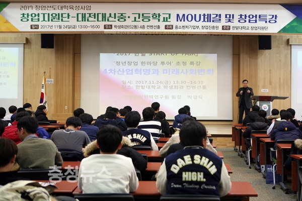 국립 한밭대학교 창업지원단(단장 송우용 교수)은 지난 24일 대학 내 컨벤션홀에서 대전대신중학교(교장 강정헌), 대전대신고등학교(교장 김영노)와 ‘교육활동 연계를 통한 학생 창업역량 강화 업무협약’을 체결하고, 대신중·고교 학생들을 대상으로 창업특강을 진행했다고 밝혔다.