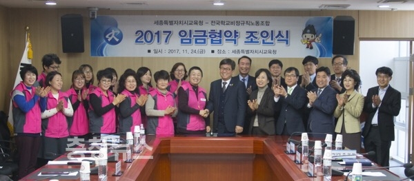 세종시교육청(교육감 최교진)이 지난 24일 교육청 3층 상황실에서 전국학교비정규직노동조합(이하 학비노조)과 ‘2017년 임금협약’을 체결했다고 27일 밝혔다.