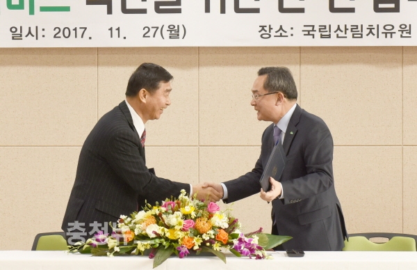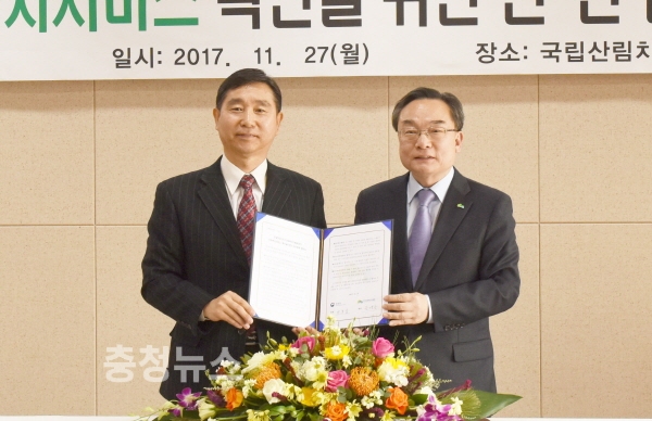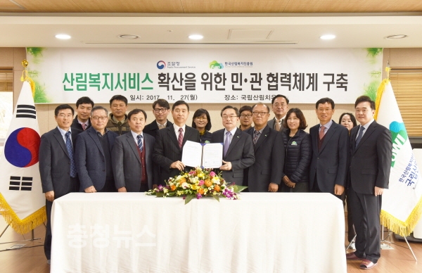 산림청 한국산림복지진흥원(원장 윤영균)과 조달청(청장 박춘섭)은 27일 경북 예천군 효자면 국립산림치유원 산림치유문화센터에서 산림복지서비스의 전자조달 활성화를 위한 업무협약(MOU)을 체결했다고 밝혔다.