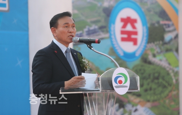 직산삼은저수지 체육공원 조성공사 기공식에서 구본영 천안시장의 인사말 모습