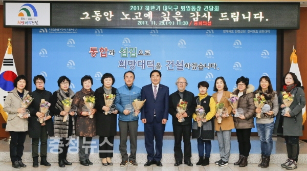 대전 대덕구(구청장 박수범)는 29일 구청 중회의실에서 퇴임하는 통장들과 간담회를 열어 감사패를 수여했다.