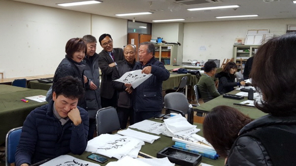 국립 한밭대학교 평생교육원을 방문한 미국 하와이대학·보이시대학 관계자들이 캘리그라피 과정 수업을 참관하고 수강생의 의견을 듣고 있다.(사진 뒤편 좌측부터 앤 이시다 호 前 하와이대 평생교육원장, 커티스 호 하와이대 교수, 임재학 한밭대 평생교육원장, 백영균 보이시주립대 교수)