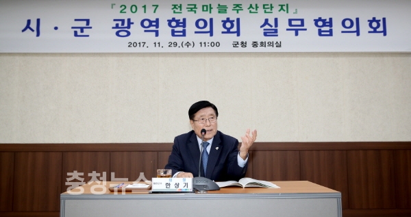 충남 태안군이 지난 29일 군청 중회의실에서 한상기 군수를 비롯, 11개 시·군 관계자 및 농협관계자 등 40여 명이 참석한 가운데 ‘2017 전국 마늘주산단지 시·군 광역협의회(의장 한상기 태안군수) 실무협의회’를 개최했다.