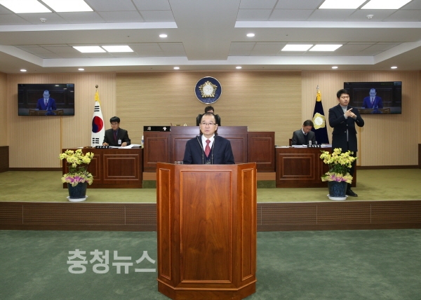 이석화 청양군수가 30일 제242회 청양군의회 제2차 정례회 군정연설을 통해 올해 군정 추진성과와 2018년도 군정운영 방향 등을 설명하고, 내년도 예산안에 대한 의회의 적극적인 협조를 당부했다.