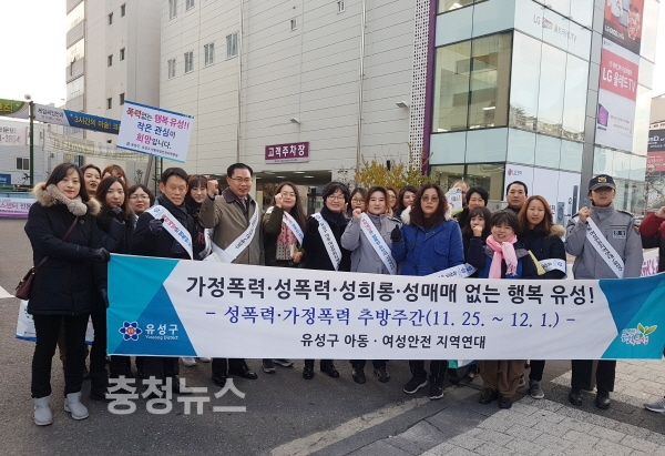 대전 유성구(구청장 허태정)가 30일 오전 유성온천역 일원에서 성폭력추방주간(11. 25. ~ 12. 1.)을 맞아 아동과 여성이 성폭력·가정폭력으로부터 안전한 유성을 만들고자 ‘민·관·경 합동캠페인’을 실시했다고 밝혔다.