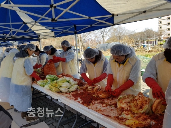 계룡시자원봉사센터(센터장 김창성)가 지난 30일 오전 계룡시노인종합복지관(관장 권주현)과 함께 계룡시자원봉사센터 옆 공원에서 관내 어려운 이웃의 따뜻한 겨울나기를 위한 사랑나눔 김장담그기 행사를 실시했다.