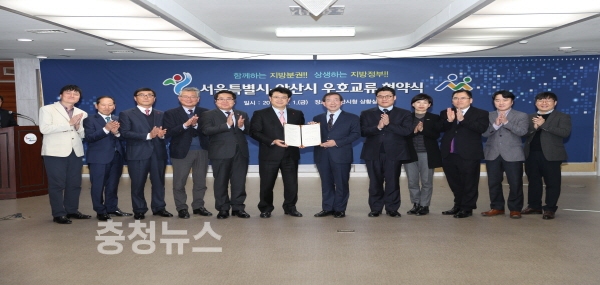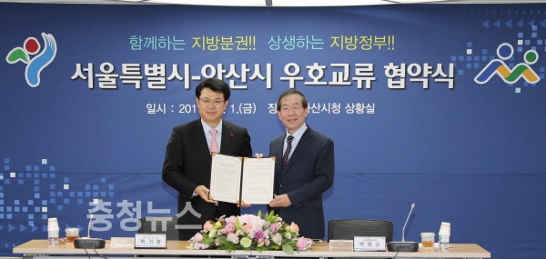 충청남도 아산시(시장 복기왕)와 서울특별시(시장 박원순)가 1일 아산시청 상황실에서 우호교류협약을 체결하고, 두 도시의 발전과 시민 복리 증진을 위한 교류․협력 의지를 다졌다.
