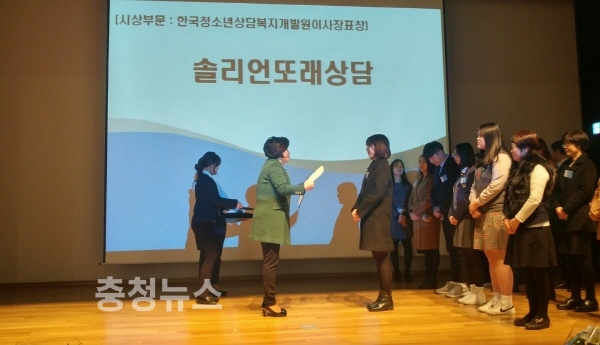 충남 천안시청소년상담복지센터(센터장 최완열)가 지난 1일 한국청소년상담복지개발원이 주최한 2017 청소년상담복지사업 시상식에서 또래상담 우수기관으로 선정돼 한국청소년상담복지개발원 이사장 표창을 받았다.