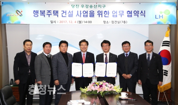 충남 당진시에 따르면 시와 LH 대전충남지역본부는 4일 당진시청 접견실에서 김홍장 시장과 김양수 대전충남지역본부장이 참석한 가운데 당진우강송산지구 행복주택 건설을 위한 업무 협약을 체결했다.