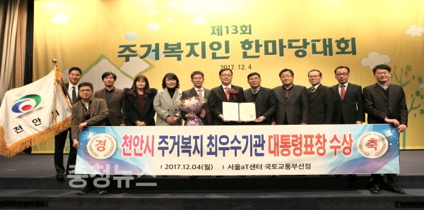 충남 천안시가 4일 서울 양재동 소재 aT센터에서 열린 ‘2017년 주거복지인한마당대회’에서 주거복지향상을 위한 노력으로 대통령표창을 수상했다.