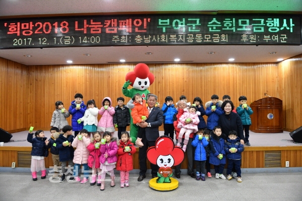 충남 부여군(군수 이용우)은 지난 1일 여성문화회관 3층에서 충남사회복지공동모금회 주관으로 ‘희망2018 나눔캠페인 부여군 이웃돕기 순회모금 행사’를 성황리에 마쳤다.