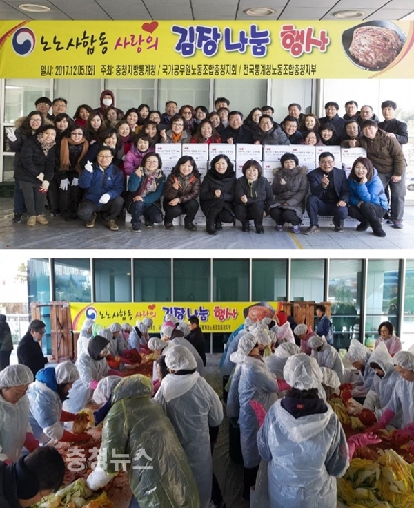 충청지방통계청(청장 진찬우)은 각 부서에서 사랑의 연탄배달, 봉사활동 등을 일상생활에서 실천하고 있는 가운데 5일에는 충청지방통계청 국가공무원노동조합과 전국통계청노동조합 합동으로‘노노사 합동 사랑의 김장나눔 행사’를 실시했다.
