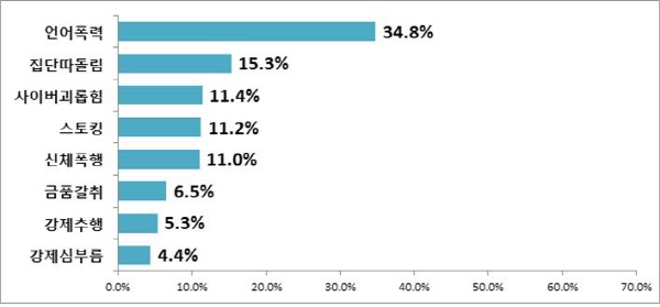 유형별로는 언어폭력, 집단따돌림, 사이버 괴롭힘, 신체폭행 순으로 나타났다. 학교폭력 피해장소는 학교 안이 71.1%, 학교 밖이 28.8%이었으며 지난해와 같이 교실 안에서 33.1%로 가장 많이 발생했으며 피해 시간도 쉬는 시간이 35%를 차지해 학급단위의 예방교육이 더욱 필요한 것으로 나타났다.