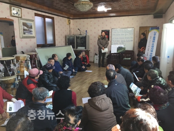 우병건 한국산림복지진흥원 산림복지사업팀장이 5일 전남 나주시 경현동 노인회관에서 주민들을 대상으로 국립나주숲체원 조성사업에 대한 설명을 하고 있다.