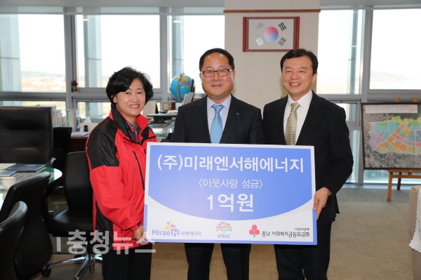 남궁영 충남도 행정부지사는 집무실에서 한권희 중부도시가스㈜ 대표와 박영수 ㈜미래엔서해에너지 대표로부터 이웃돕기 성금으로 5000만 원과 1억 원을 기탁 받았다.