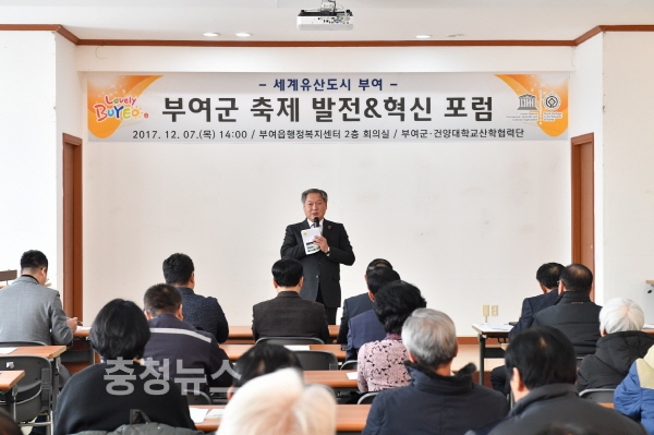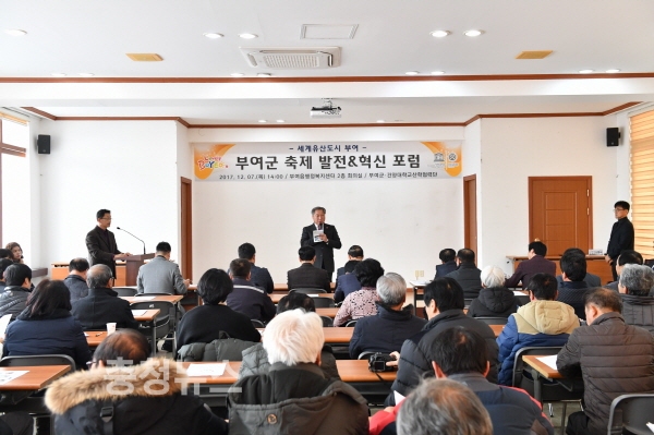 충남 부여군은 지난 7일에 부여읍 행정복지센터 회의실에서 부여군의회의원,각 읍면 이장단 회장, 협력기관·단체, 언론인, 부여군 상권 활성화 구역 상인·번영회, 충남연구원 , 관계공무원 등 100여명이 참석한 가운데 부여군 축제 발전 & 혁신 포럼을 가졌다.