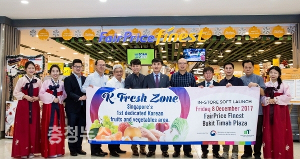 농림축산식품부(장관 김영록)와 한국농수산식품유통공사(aT, 사장 여인홍)는 지난 8일 싱가포르 최대 유통 체인점 NTUC 페어프라이스에서 딸기와 포도, 버섯 등 30여 품목의 한국산 신선농산물을 판매하는 ‘K-Fresh Zone’을 오픈했다고 밝혔다.