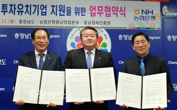 도는 11일 도청 국제회의실에서 NH농협은행 충남영업본부, 충남경제진흥원과 업무협약을 맺고, 국내투자유치 기업에 대한 행·재정적 지원을 통한 투자촉진 환경조성에 힘을 모으기로 했다.