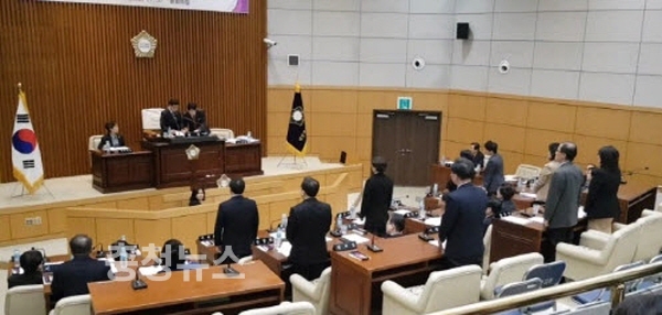 12일 서구의회 민주당 의원들이 기립으로 반대표를 던지는 모습