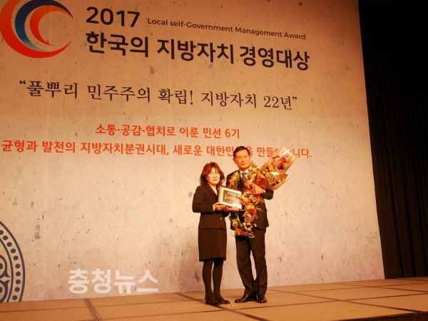 동아일보가 주최하고 행정안전부가 후원하는 ‘2017지방자치경영대상’은 국제화, 산업, 청년정책, 문화관광, 환경보존, 일자리 창출, 주민 복지 등 20개 부문을 두고 엄격한 전문가 심사를 거쳐 행정혁신에 탁월한 성과를 거둔 지자체에게 주어지는 상이다. 시상식은 13일 서울 밀레니엄 힐튼호텔에서 있었다.