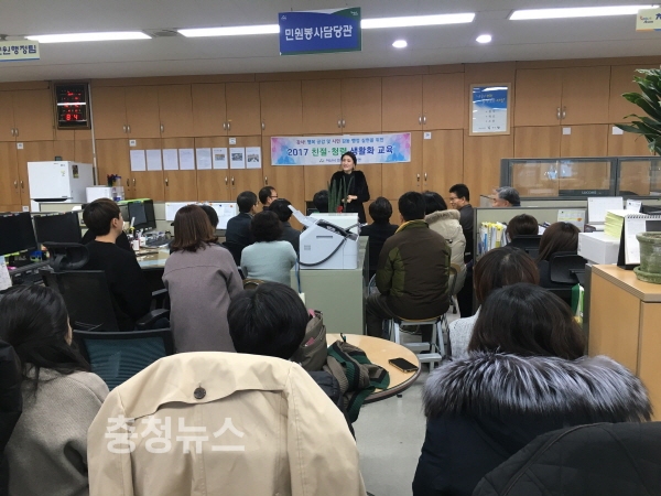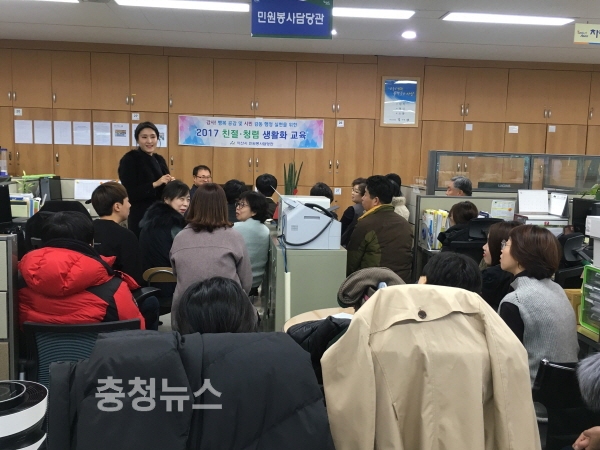 지난 12월 12일에는 분기별로 실시하는 민원실 직원 친절교육 으로 친절 전문강사 이윤희 주무관의 “누구든 타인에게 인정받고 싶은 욕구가 있다. 오늘은 금년 1년간 같이 생활했던 직원 간에 생각을 공유하는 시간을 마련했다”라는 주제로 잠시나마 평소 고생하는 동료직원간의 진솔한 마음을 읽을 수 있는 시간을 가졌다.