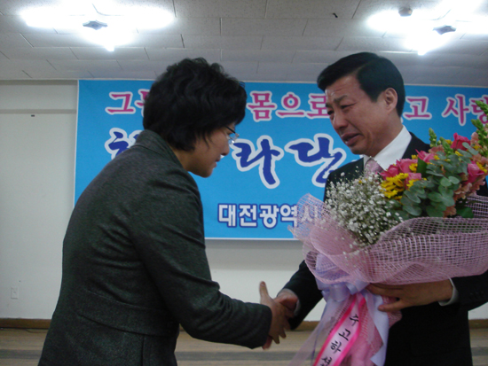 ▲ 조재철 여성부장으로 부터 꽃다발을 받고 울고 있는 이재선 위원장