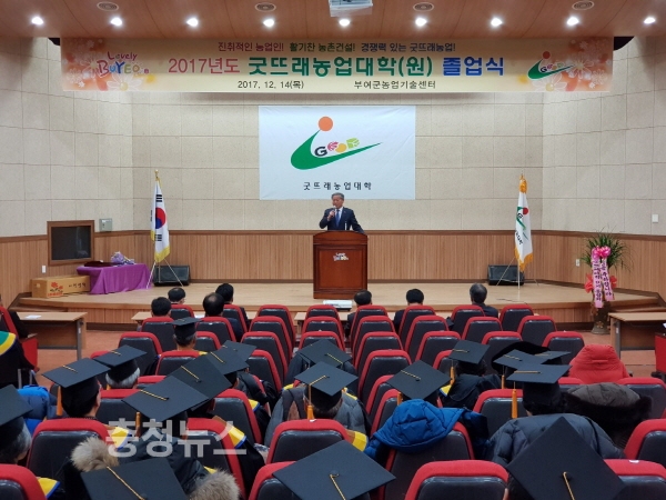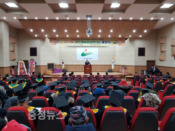 2017학년도 굿뜨래농업대학(원) 졸업식에는 환경농업과 28명, 토마토과 24명, 양봉과 25명, 6차산업과(대학원) 27명 총 104명의 졸업생이 가족 및 내빈들의 축하를 받으며 졸업장을 받았다.