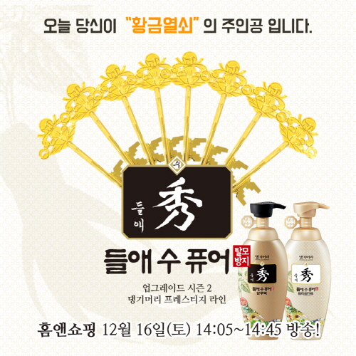 방송에서는 댕기머리 ‘들애수 퓨어 샴푸’ 정품(400ml) 9개와 여행용 들애수 퓨어 샴푸(200ml) 3개, 집중영양팩(200ml) 2개, 두피 앰플(145ml) 2개로 구성된 상품을 선보인다. 또한 샴푸 대신 트리트먼트(400ml) 3개를 혼합한 상품도 선보인다.