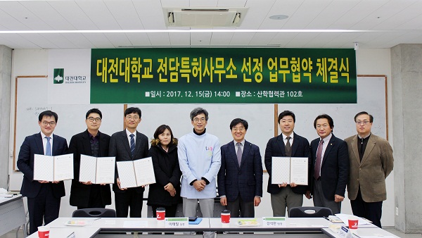대전대 산학협력단(단장 황석연)은 15일 대학 산학협력관에서 황석연 단장을 비롯해 김동희 창업•사업화부단장과 강석만 산학협력팀장 및 전담특허사무소 관계자들이 참석한 가운데 전담특허사무소 4곳과 업무협약(MOU)을 체결했다.