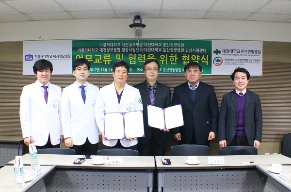 대전대 둔산한방병원(병원장 오민석)과 대전대 둔산한방병원 임상시험센터(센터장 박양춘)는 가톨릭대 대전성모병원(의무원장 이동수), 가톨릭대 대전성모병원 임상시험센터(센터장 김영율)와 공동 임상연구 수행을 위해 최근 4자간 상호협력협약(MOU)을 체결했다고 18일 밝혔다.
