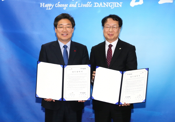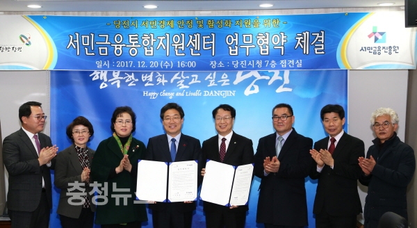 충남 당진시에 따르면 시와 서민금융진흥원은 20일 당진시청 접견실에서 김홍장 시장과 최건호 서민금융진흥원 부원장, 조성만 소상공인협의회 회장, 황선숙 시의원 등이 참석한 가운데 서민금융통합지원센터 업무협약을 체결했다.